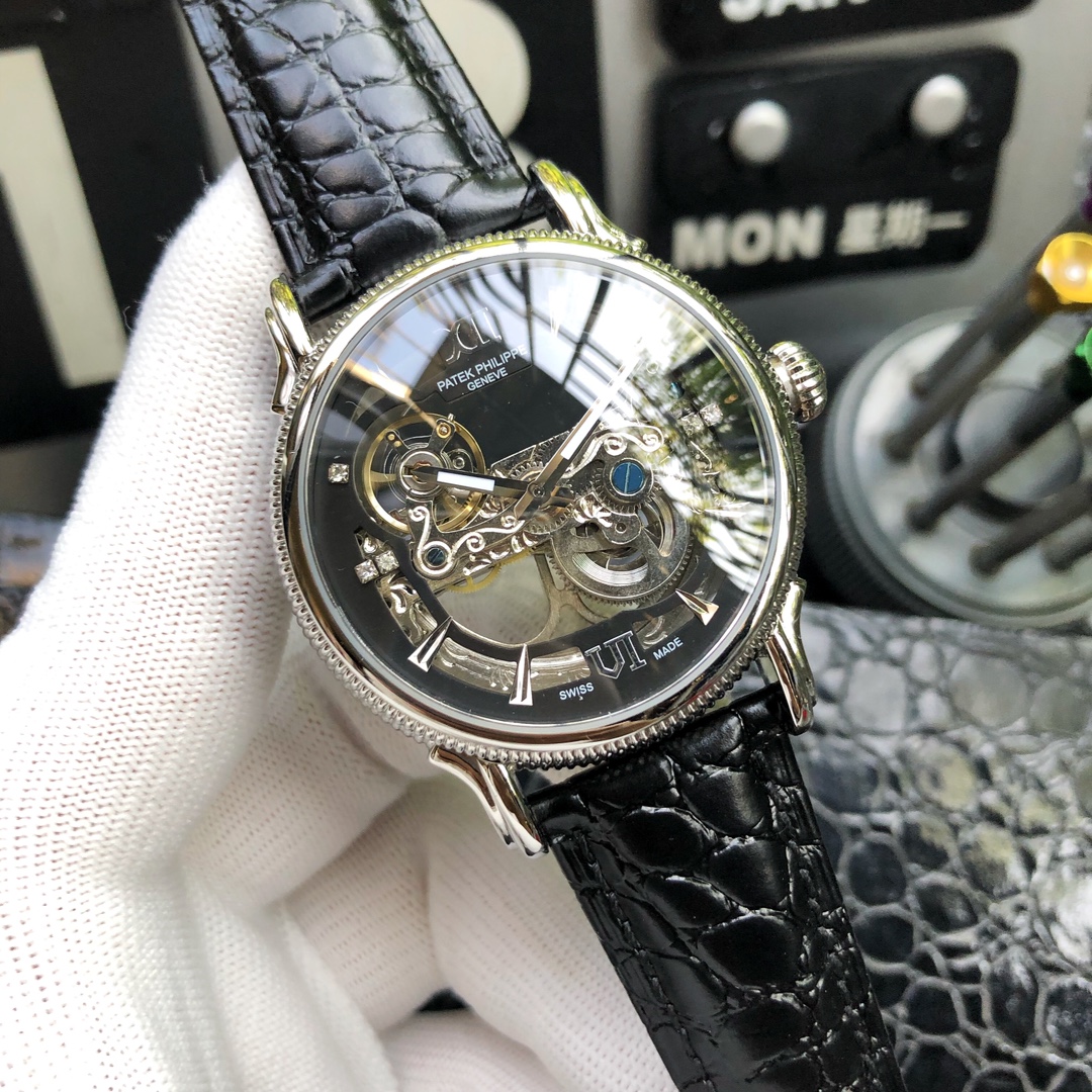 Experience luxury with this Patek Philippe men's watch featuring a skeleton mechanical movement, 316 stainless steel, and a genuine leather band.