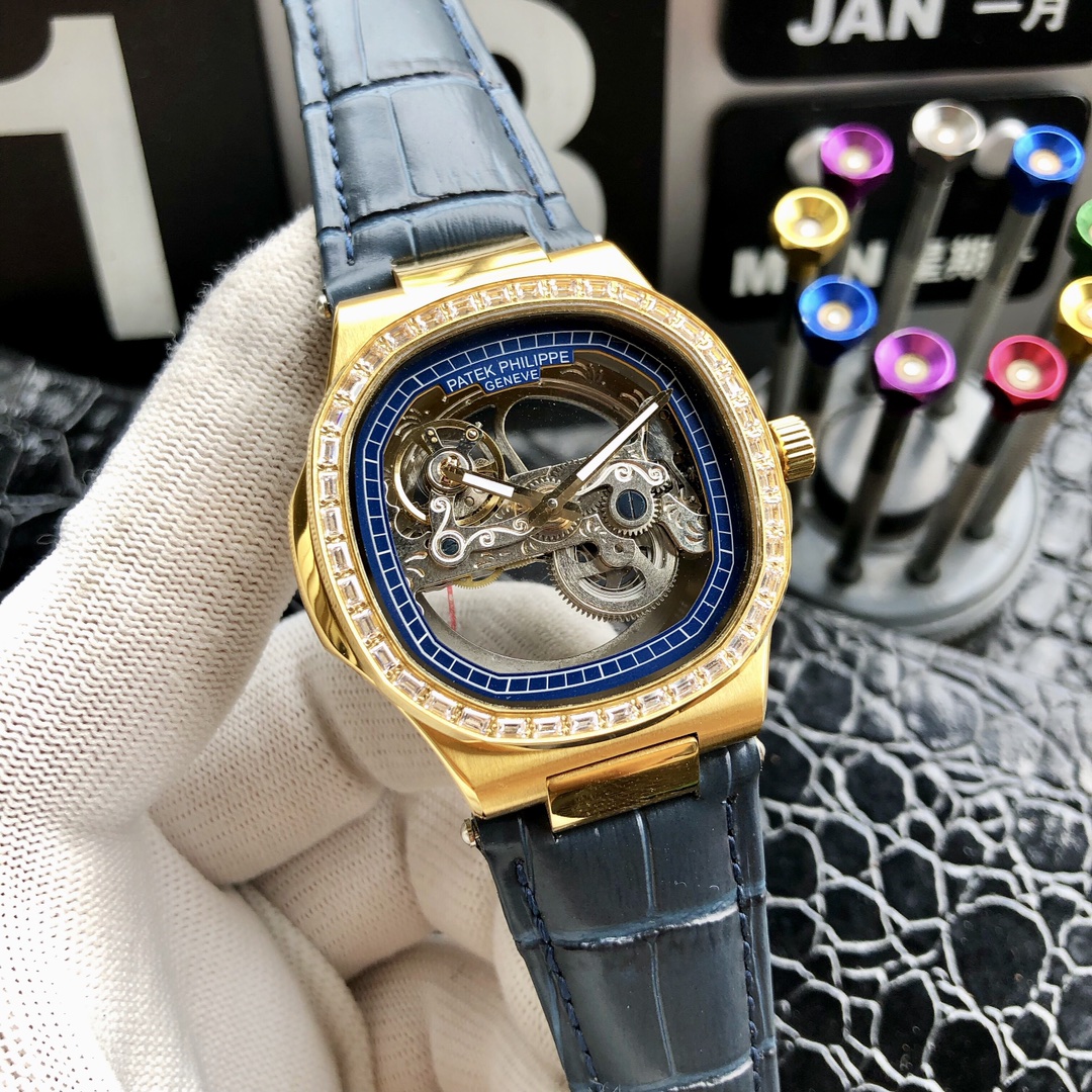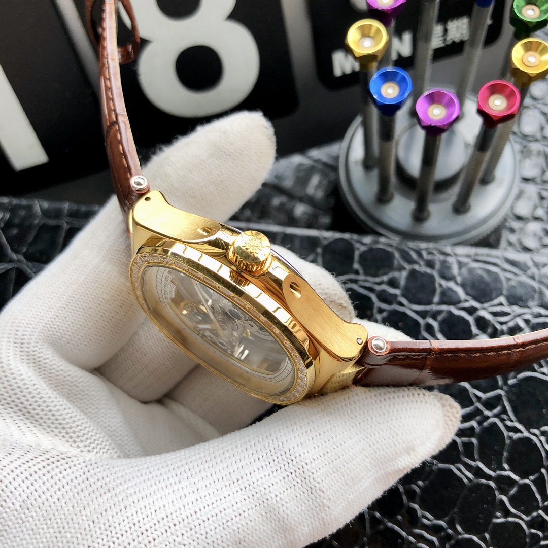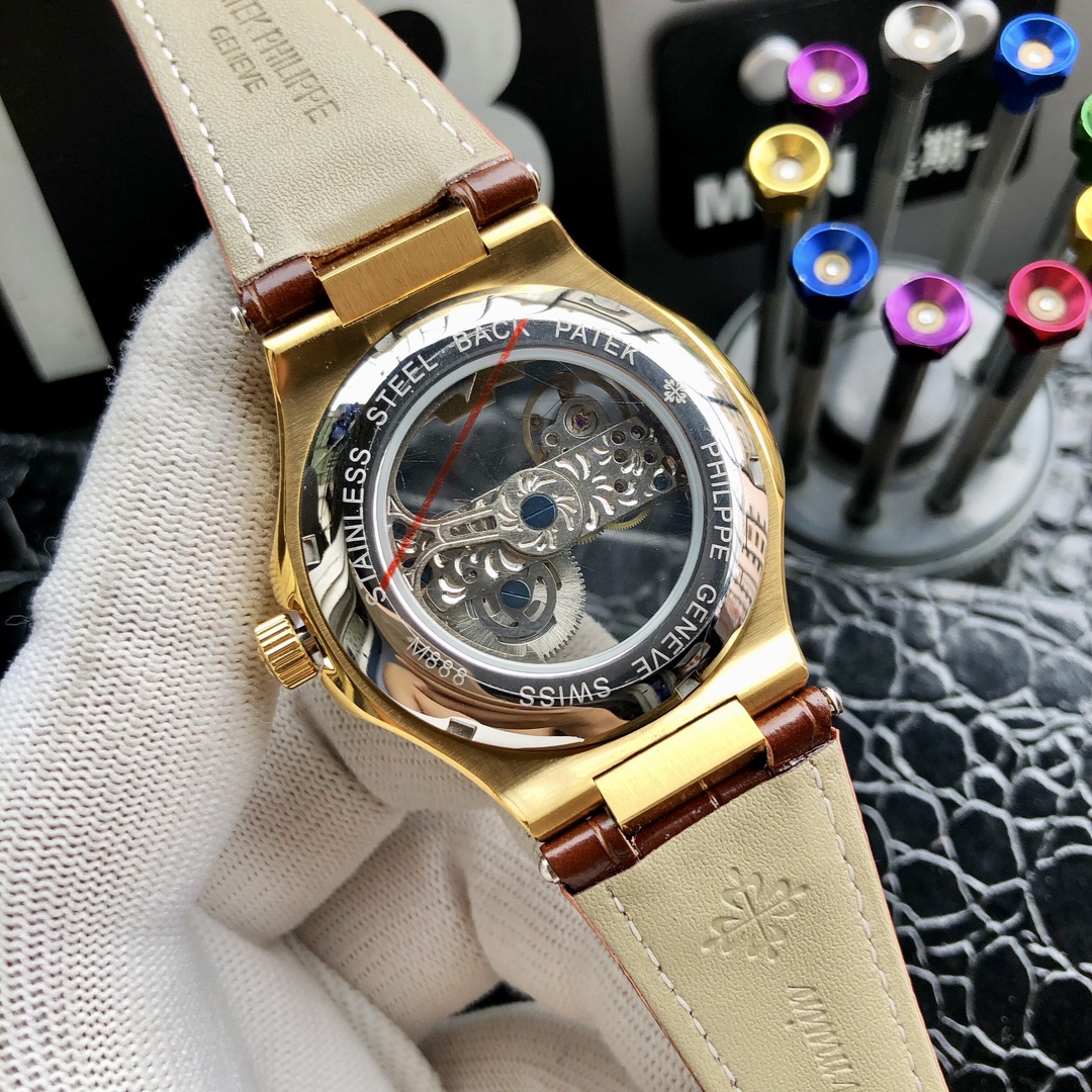 Elevate your style with this luxurious Patek Philippe Nautilus men's watch. Features a stunning skeleton dial, gold-tone finish, and premium leather band.