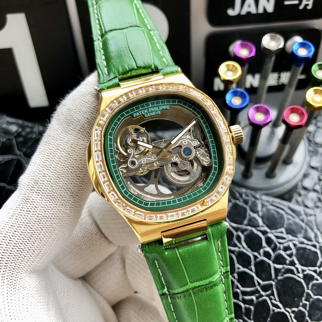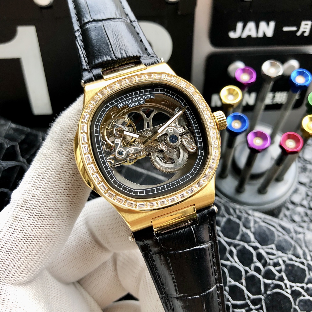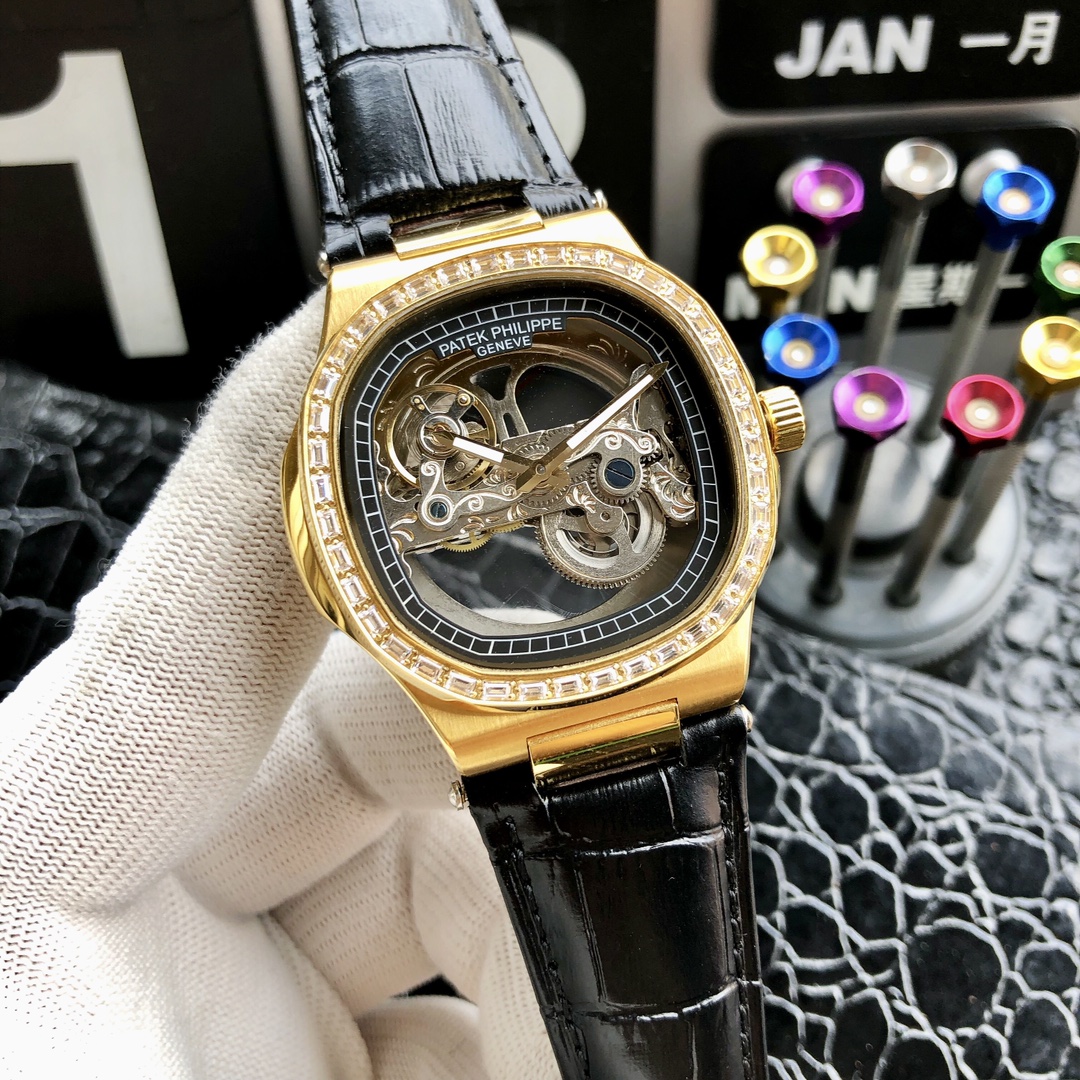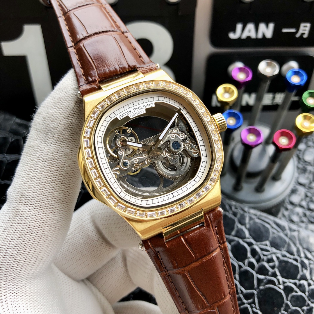 Elevate your style with this luxurious Patek Philippe Nautilus men's watch. Features a stunning skeleton dial, gold-tone finish, and premium leather band.